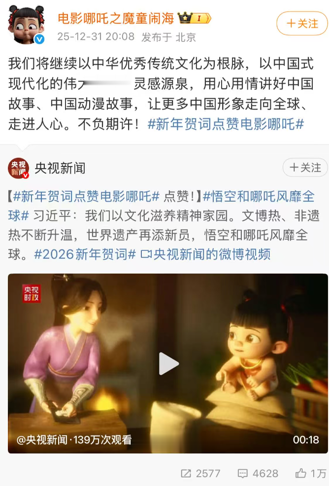 @电影哪吒之魔童闹海表示:“我们将继续以中华优秀传统文化为根脉,以中国式现代化的伟大实践为灵感源泉,用心用情讲好中国故事、中国动漫故事,让更多中国形象走向全球、走进人心。不负期许!”